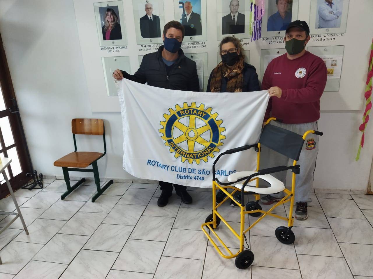 Referente a doação da cadeira de rodas, o Rotary doou no final da tarde da nesta quarta-feira (30/06) uma cadeira de rodas de banho do seu Banco Ortopédico para a APAE de São Carlos conforme foi prometido, pois o valor arrecado foi bem inferior ao valor de custo de uma cadeira de rodas e com certeza irá auxiliar os alunos da referida instituição.