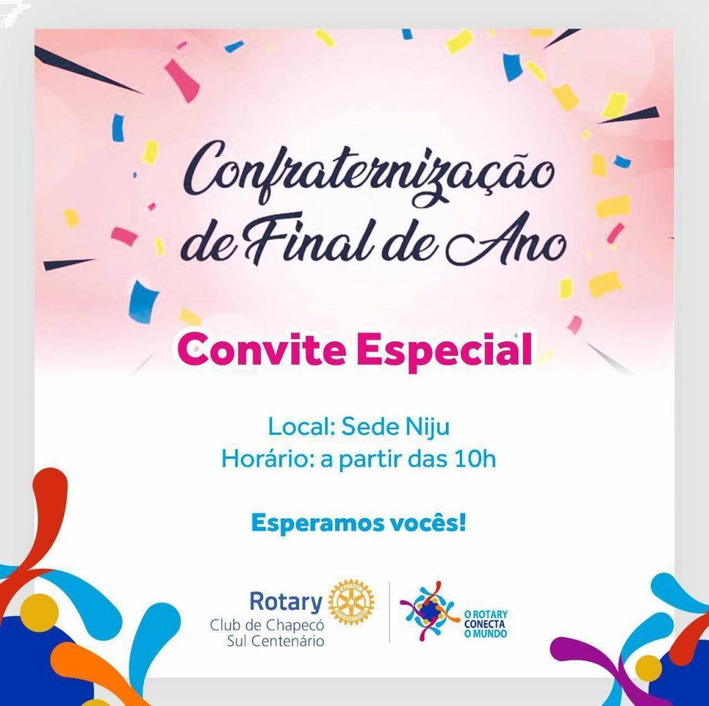 Confraternização encerramento ano rotario gestao 2019/2020 com todos os companheiros realizar-se-a na sede da Niju - bairro Engenho Braum no dia 01/12/2019 a partir das 10:00hrs, convido a todos os companheiros para passar um dia especial e muito divertido.
