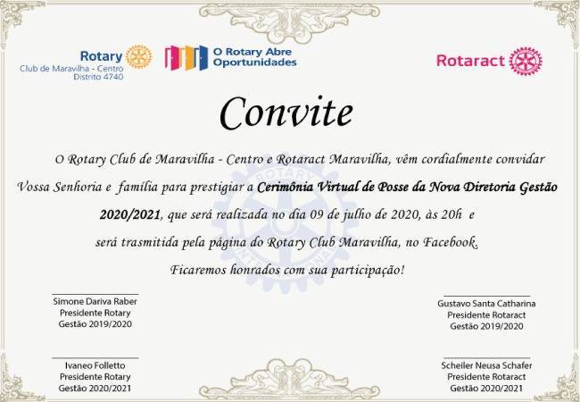 Cerimônia Virtual de Posse da Nova Diretoria Gestão 2020/2021 do Rotary CLub de Maravilha e Rotaract Maravilha, que será realizada no dia 09 de julho de 2020, às 20h.