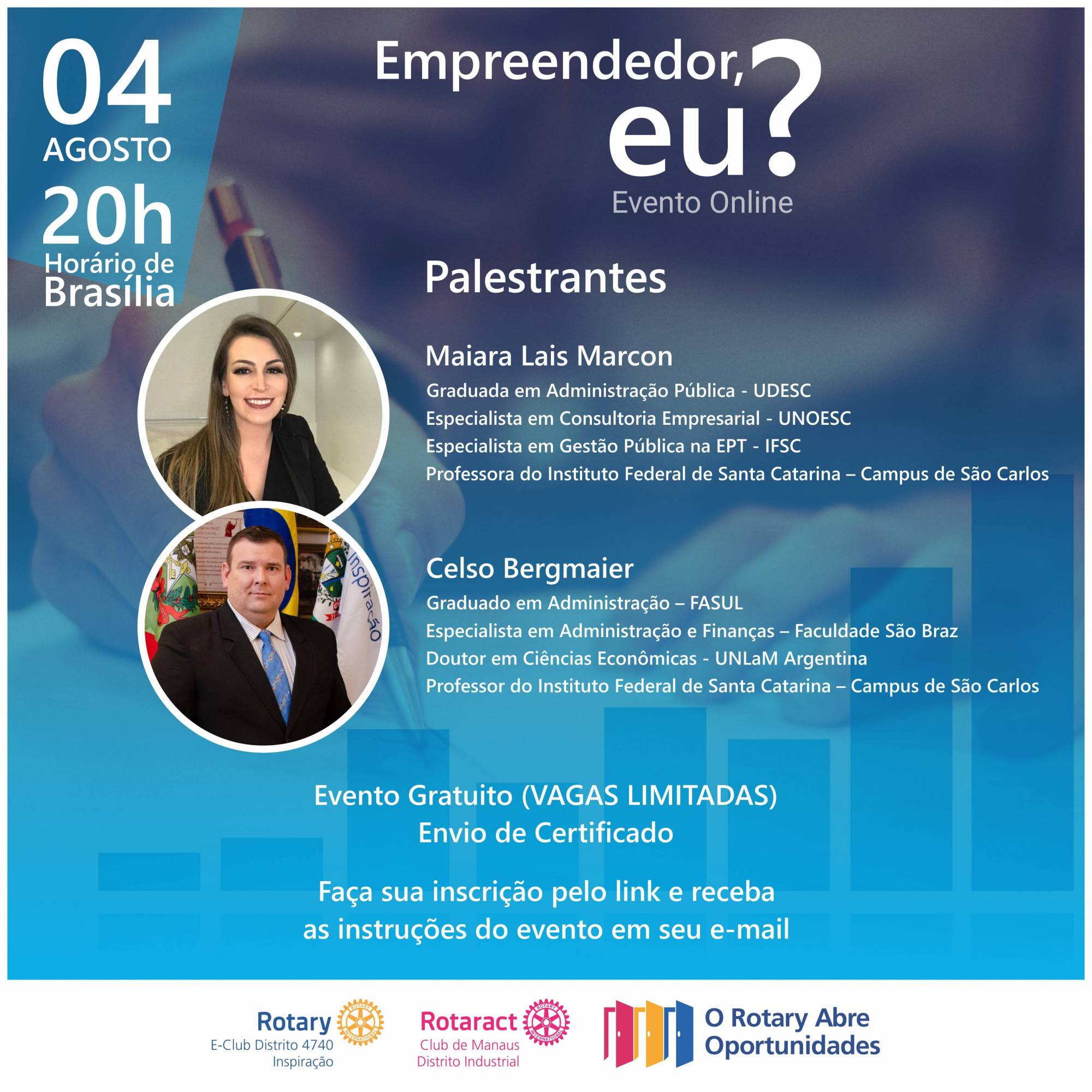 Uma palestra virtual foi organizada pelo Rotary E-Club Distrito 4740 – Inspiração e Rotaract Club de Manaus-Distrito Industrial no último dia 04 de agosto. O evento teve por objetivo contribuir com profissionais e pessoas que desejam empreender, quebrando mitos relacionados ao tema e demonstrando as diferentes formas de empreender. A Palestra foi transmitida pelo canal do YouTube e contou com 192 inscritos de 17 Estados do País, número que surpreendeu os próprios organizadores. A palestra foi ministrada pelo Companheiro e Professor Celso Bergmaier e pela professora Mairara Lais Marcon, ambos docentes do Instituto Federal de Santa Catarina.